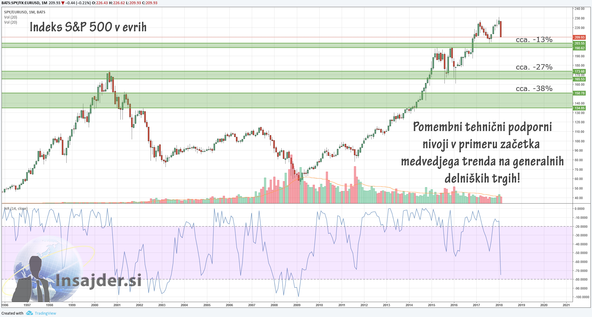 Analizo smo naredili na grafu ameriškega borznega indeksa S&P 500, ki smo ga denominirali v evro. Kar želimo poudariti je, da kljub ekstremno visokim nivojem na generalnih delniških trgih, še vedno obstaja precej velika verjetnost nadaljevanja rastočega trenda, vendar pa bi kratkoročno lahko videli večje slapovne padce, ki bi ponudili dobre kratkoročne vstopne točke za swing traderje.