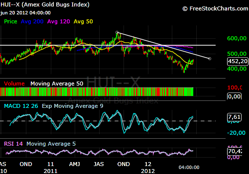 Če se vrnemo na včerajšnje dogajanje. Zelo pomembno za plemenite kovine, je bil nenaden preobrat zlata in srebra po razprodaji, tik po izjavi Bernankeja, kar potrjuje, da smo najverjetneje dosegli dno med 1500-1600 $ za zlato in 27 -28$ za srebro. Prav tako je opaziti relativno moč rudarjev, saj je HUI včeraj izgubil le 0,84%, medtem, ko je cena zlata padla za približno isti odstotek.