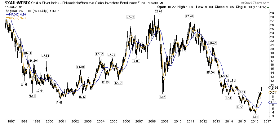 Rudarski sektor XAU v razmerju z S&P 500 (delniškim trgom)